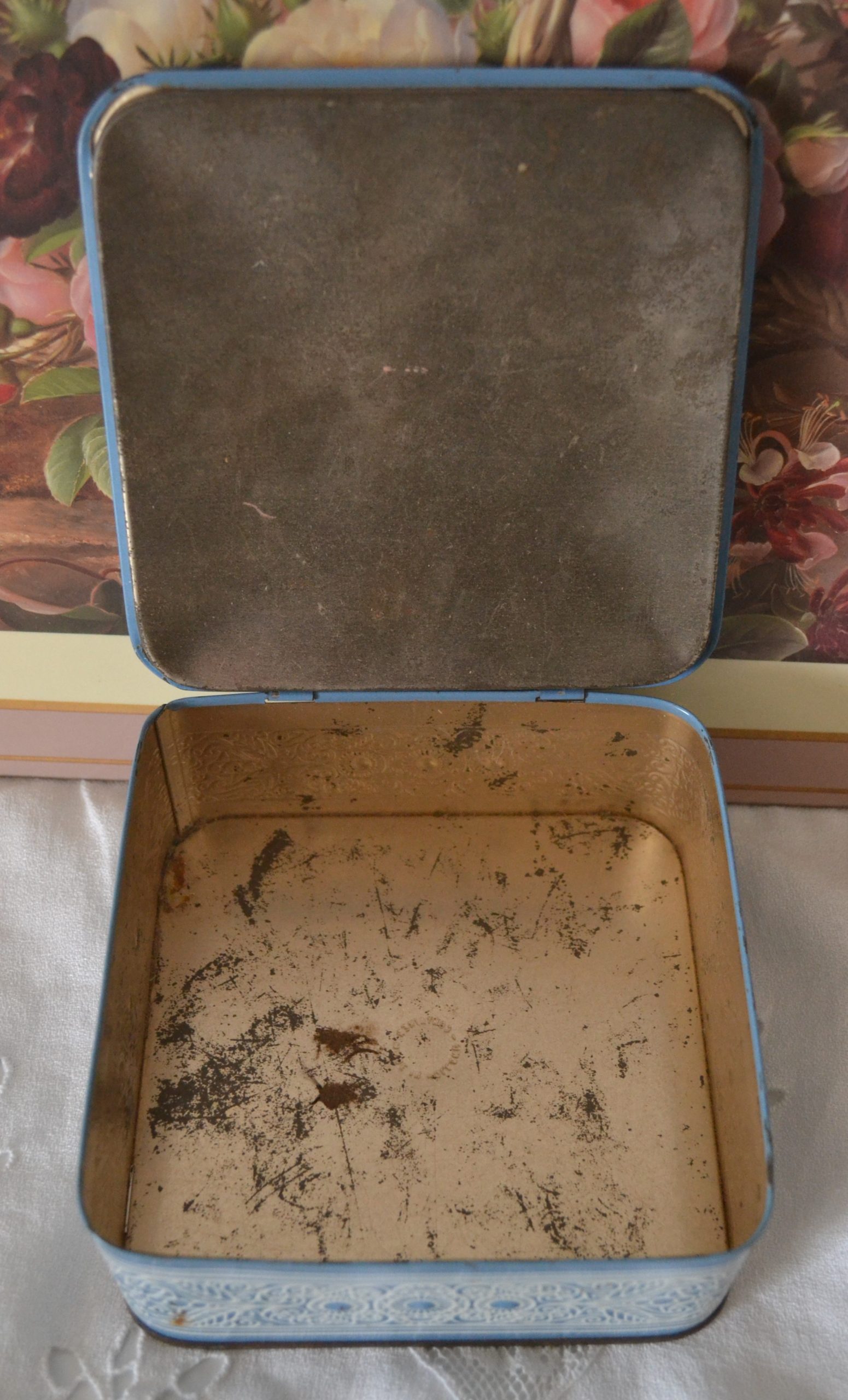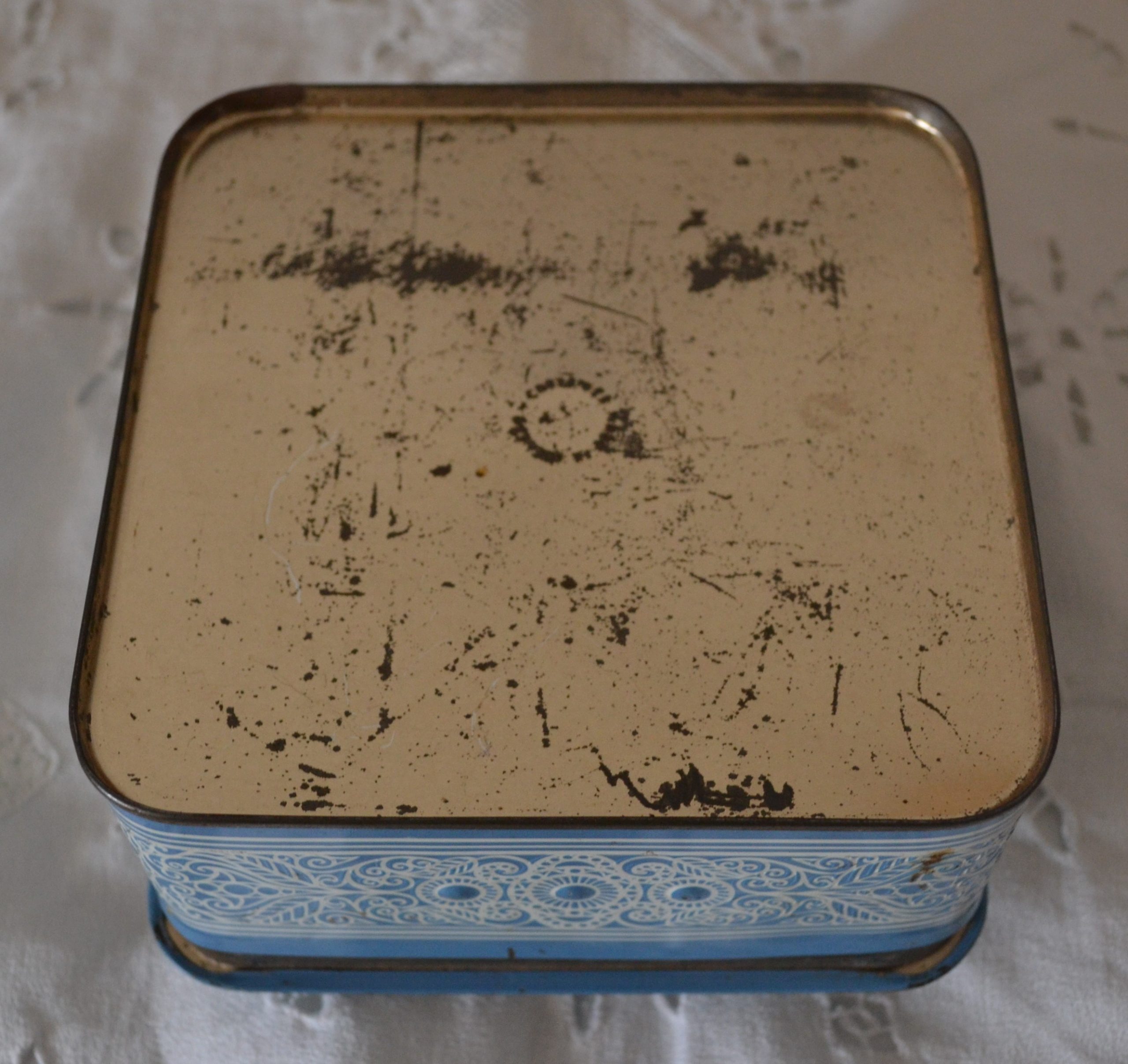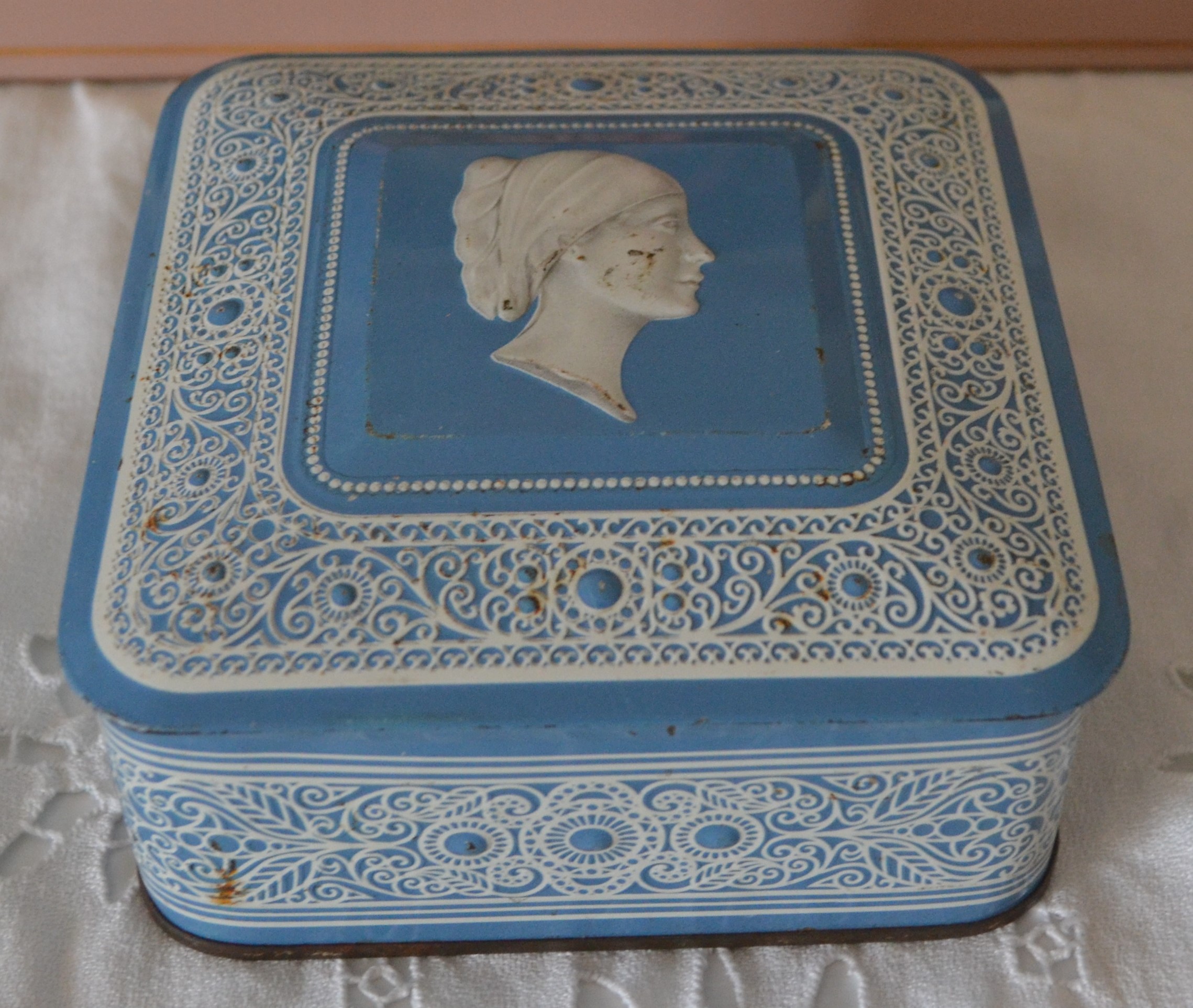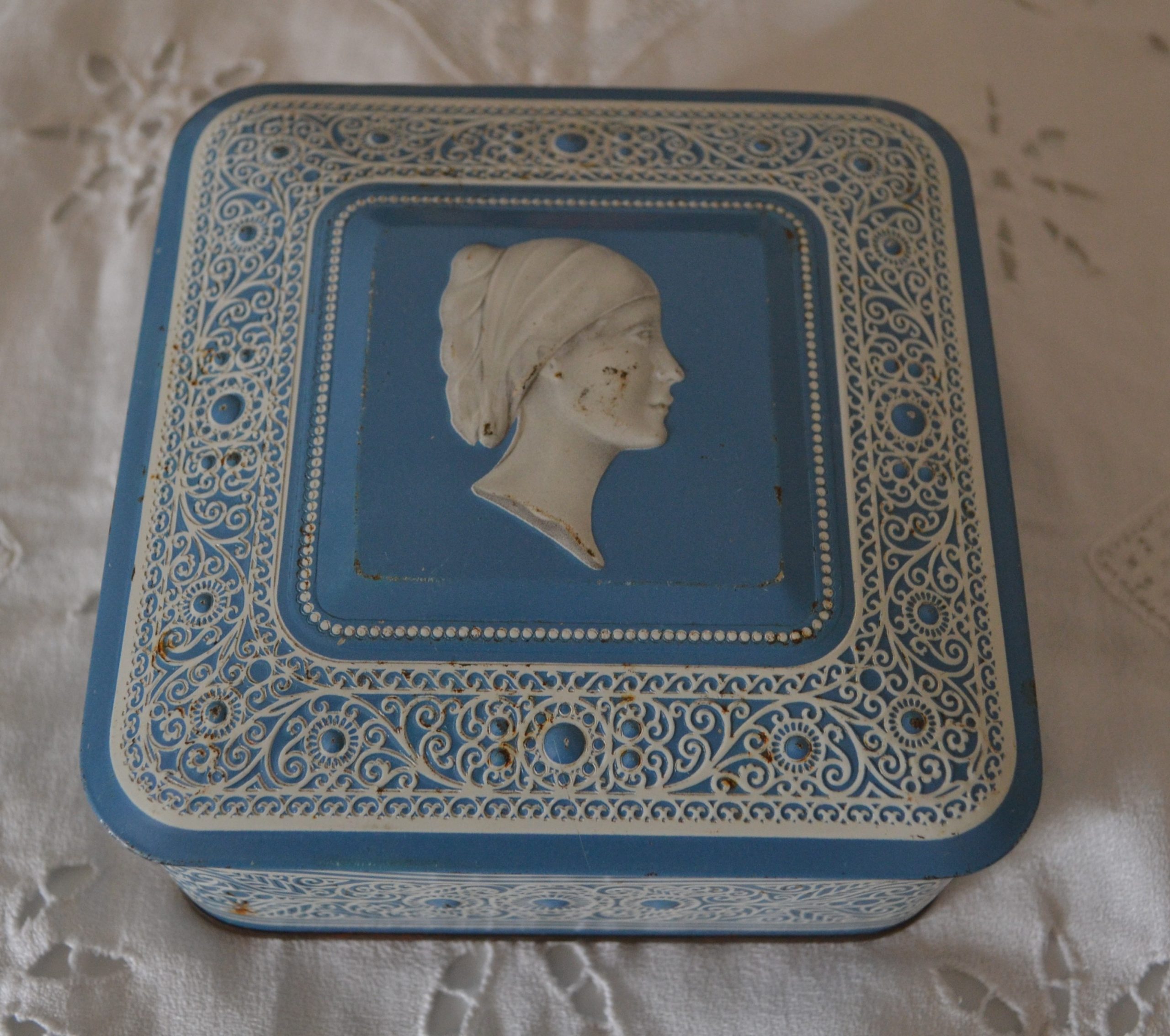 Boite en métal bleu avec décors en relief blanc.