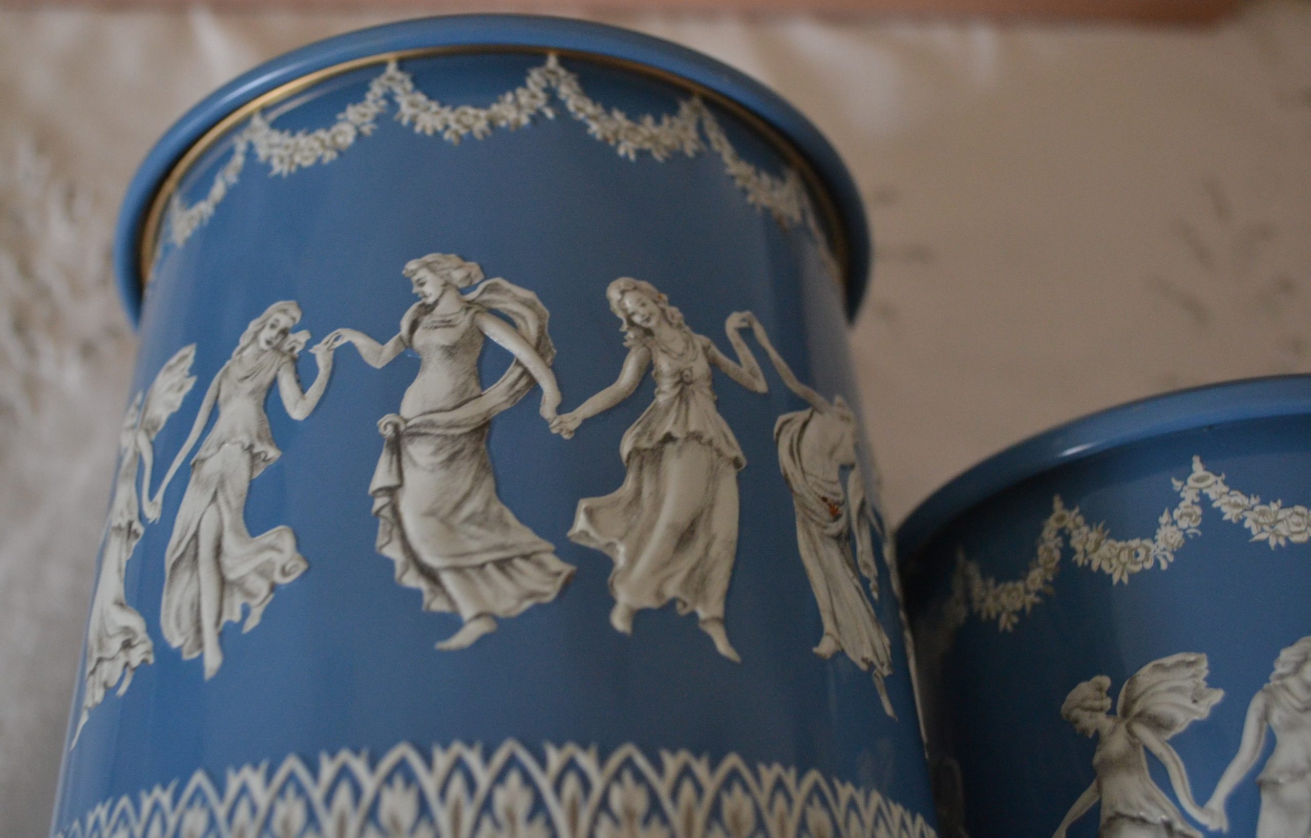 Fond bleu surplombant des danseuses antiques et des couronnes de fleurs, le tout en relief.