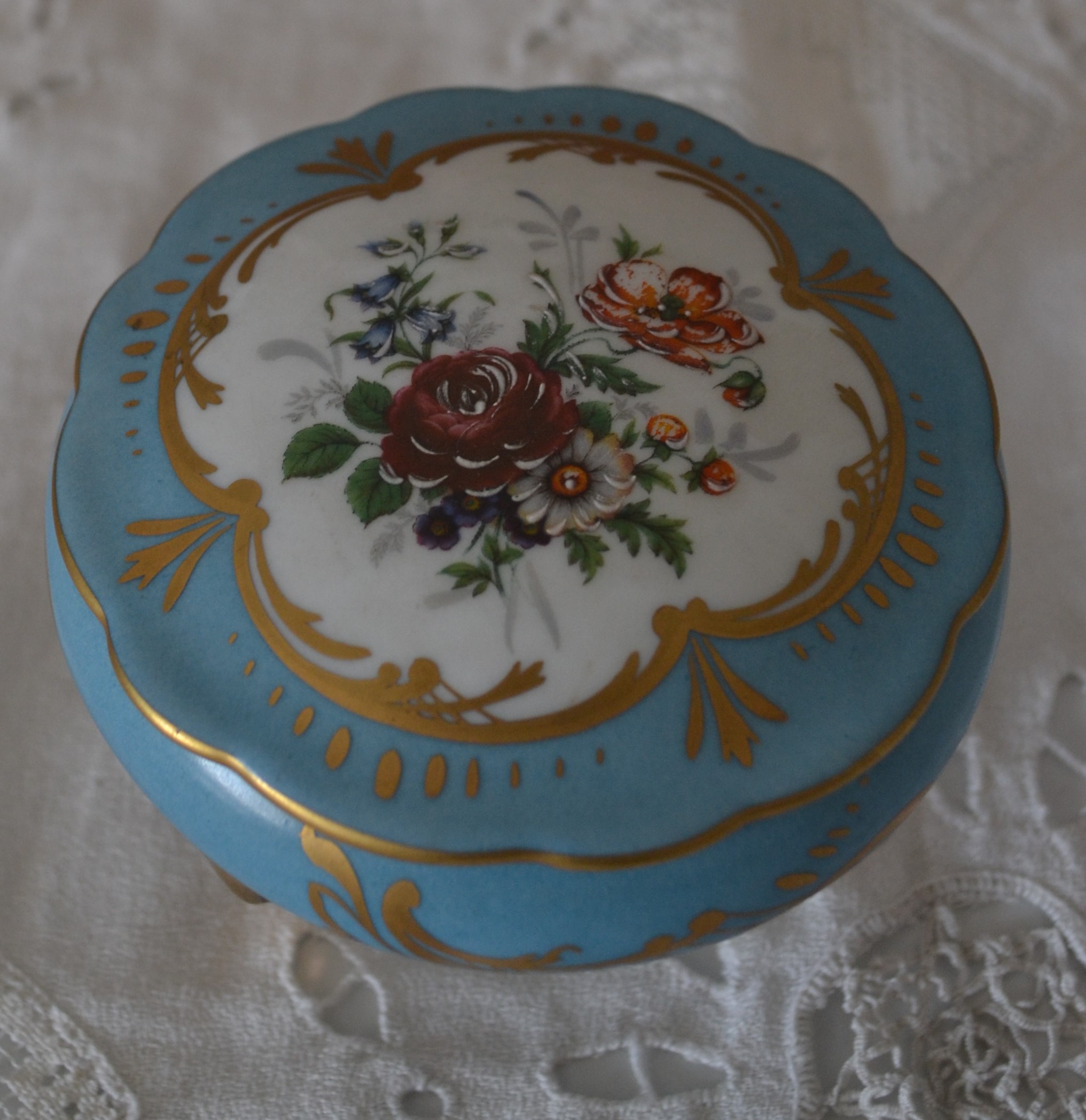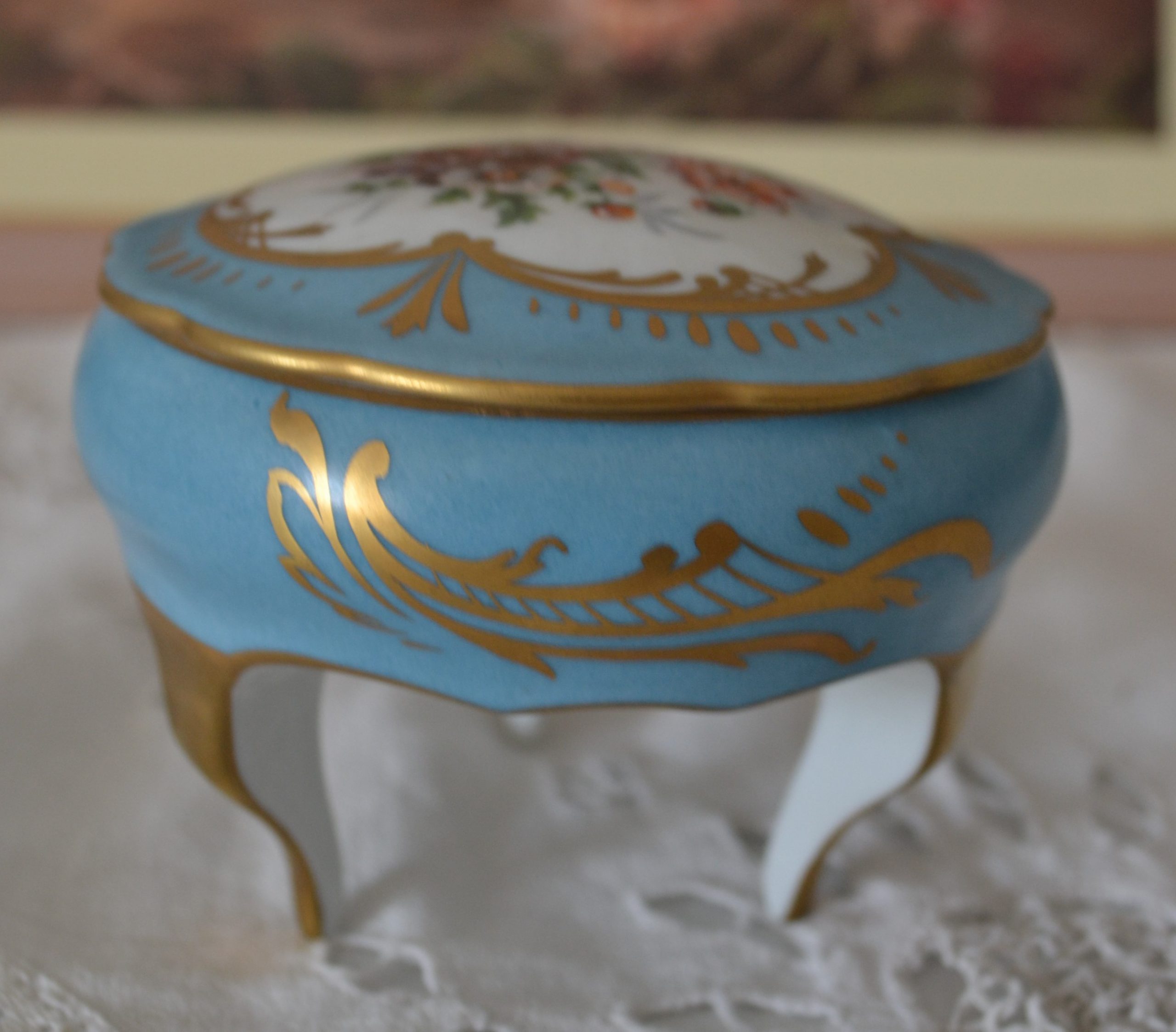 Très élégante bonbonnière en porcelaine décorée à la main avec sobriété et délicatesse dans laquelle vous pourrez, au choix, glisser des chocolats comme des bijoux