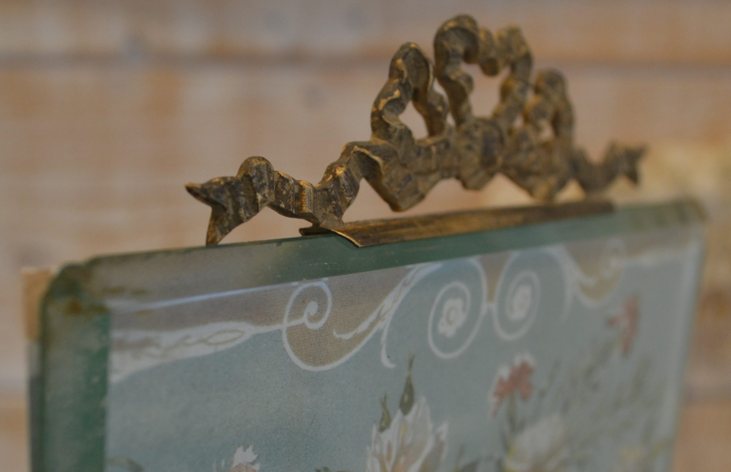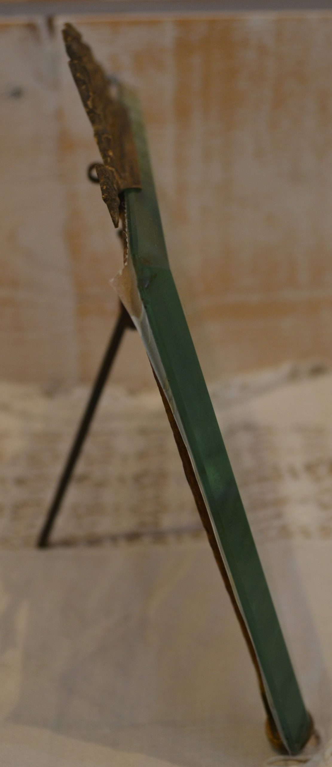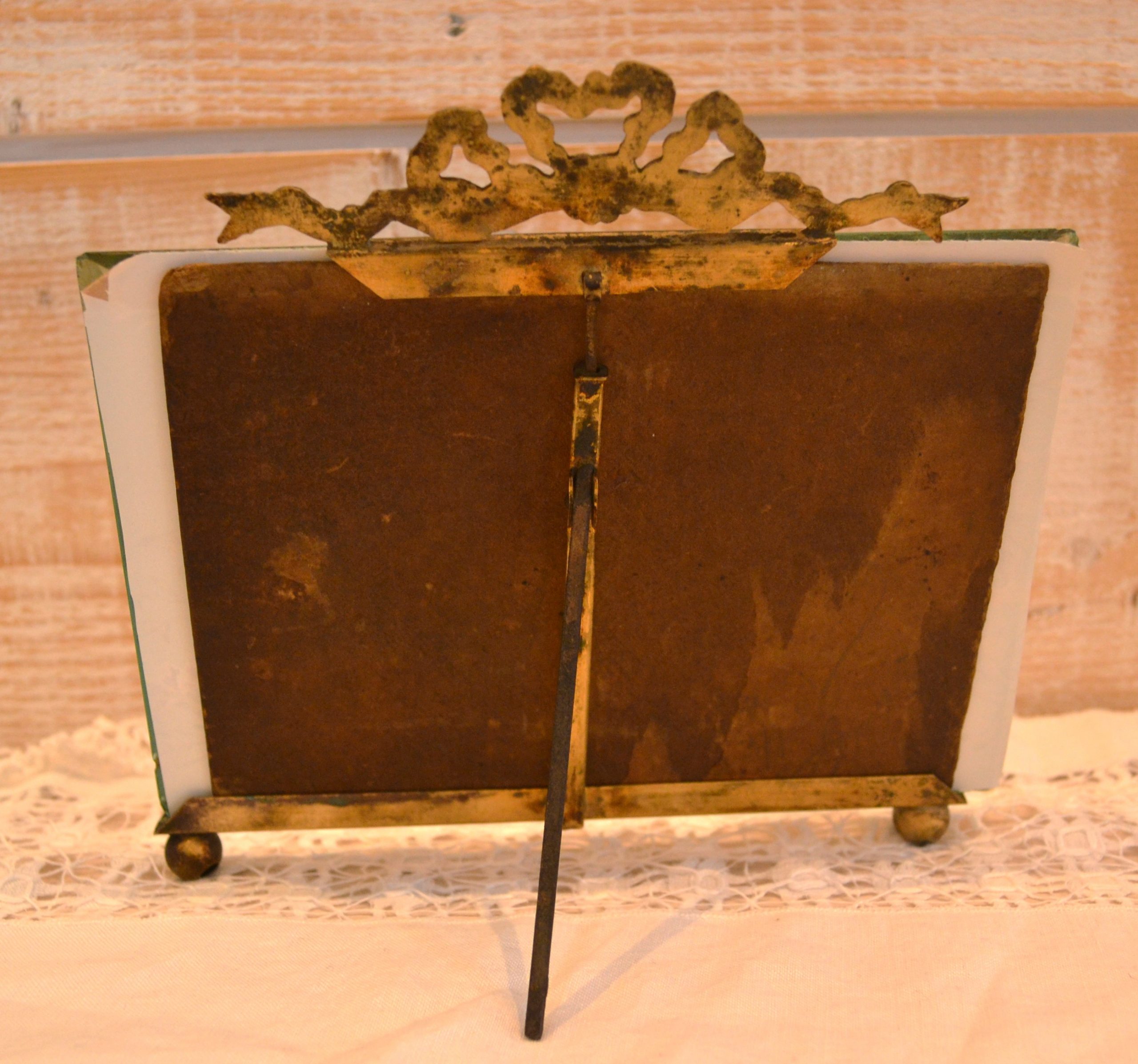 Encadrement en laiton, nœud au sommet, 2 pieds ronds, barre en métal à l’arrière inclinable pour le maintient.