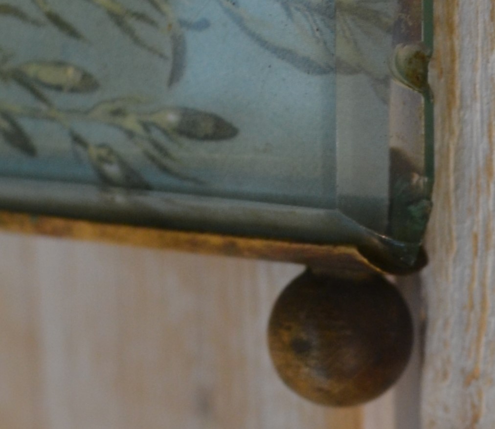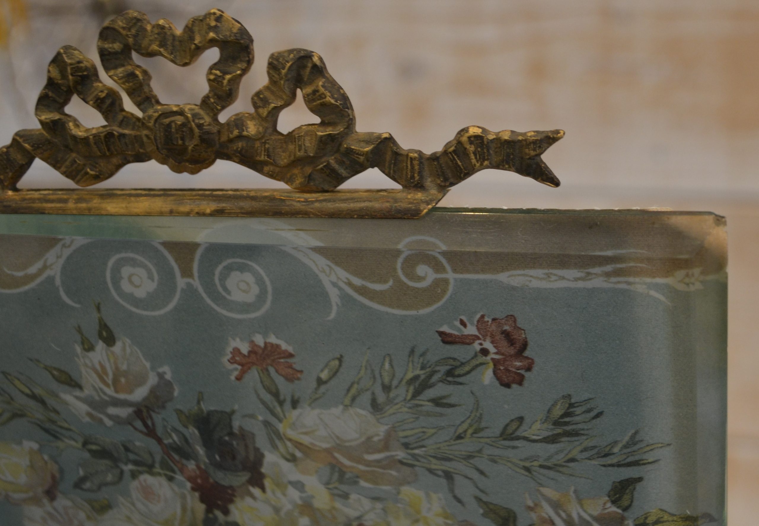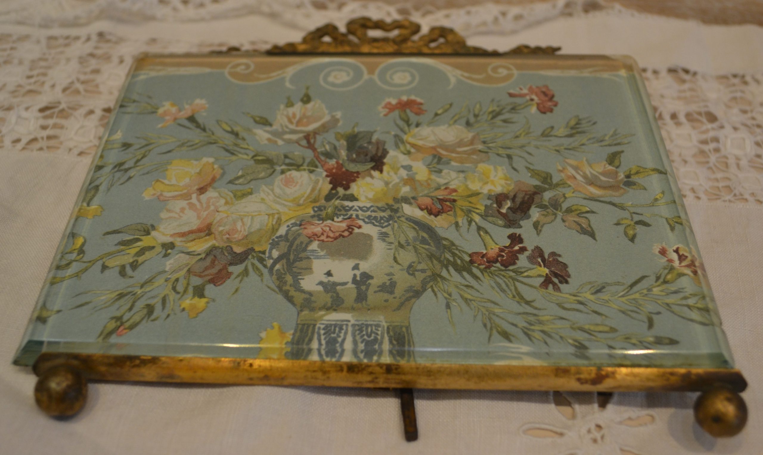 Encadrement en laiton, nœud au sommet, 2 pieds ronds, barre en métal à l’arrière inclinable pour le maintient.