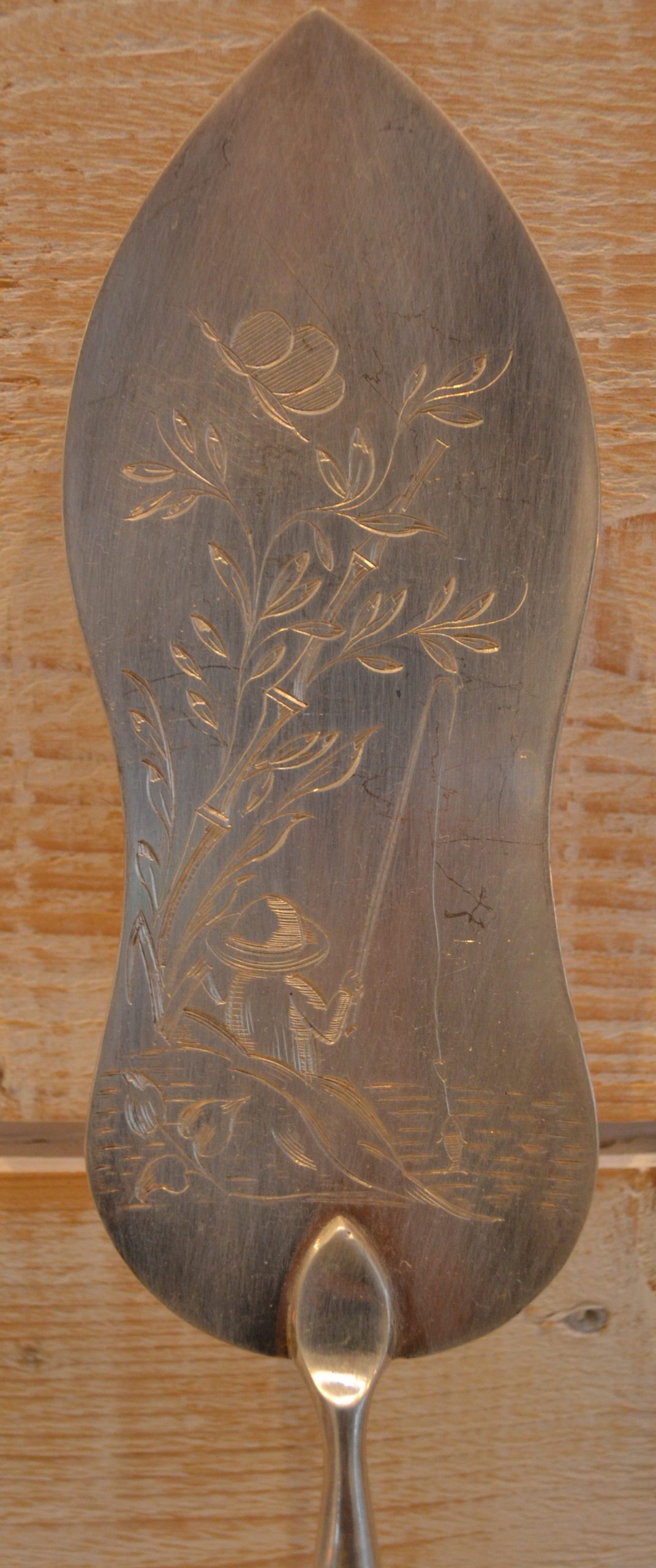 Pelle à poisson en métal argenté gravée d’un dessin de pécheur à la ligne.