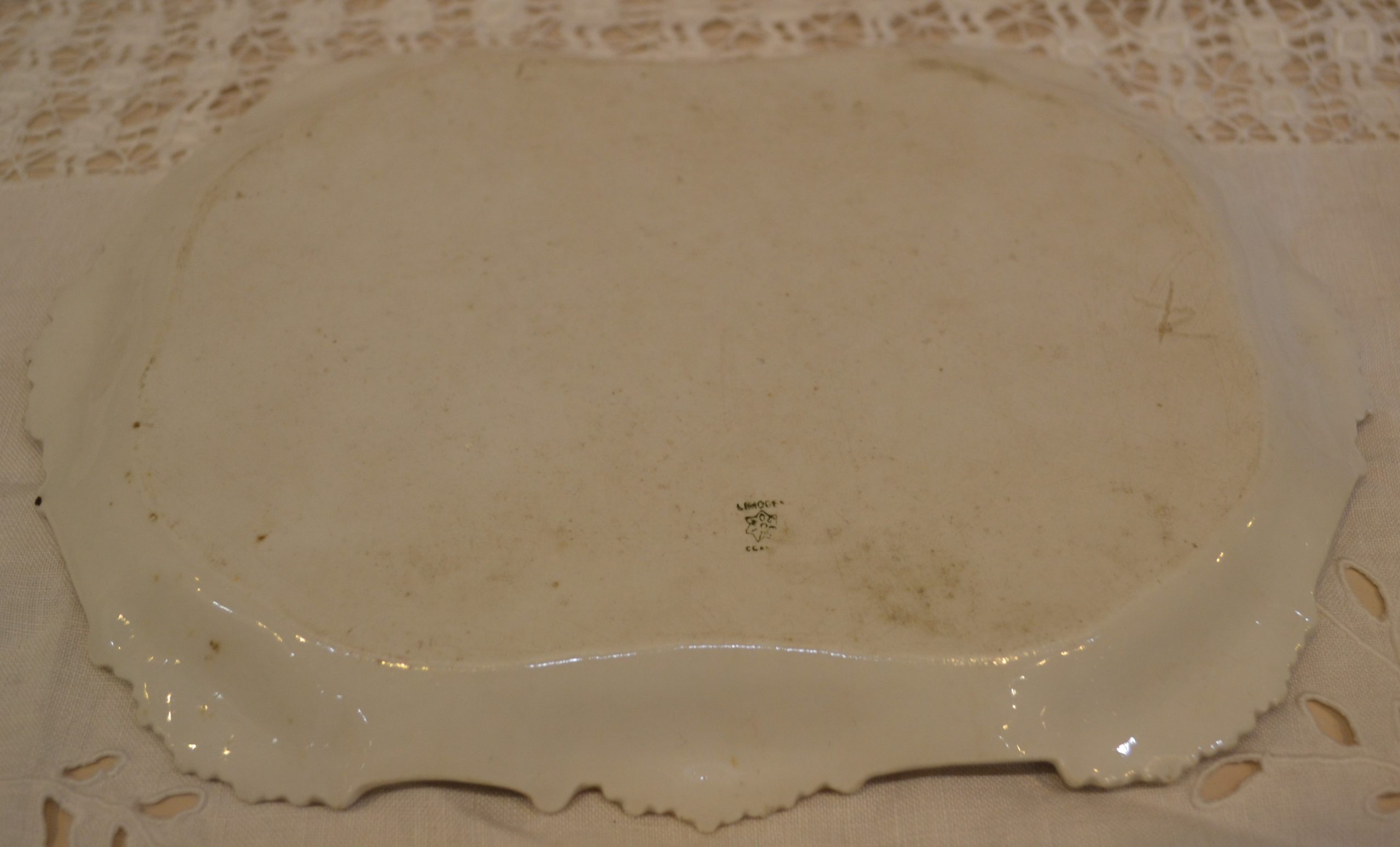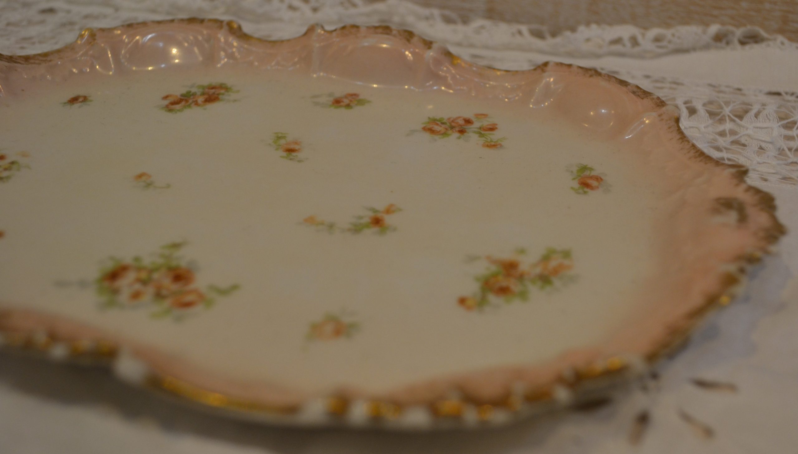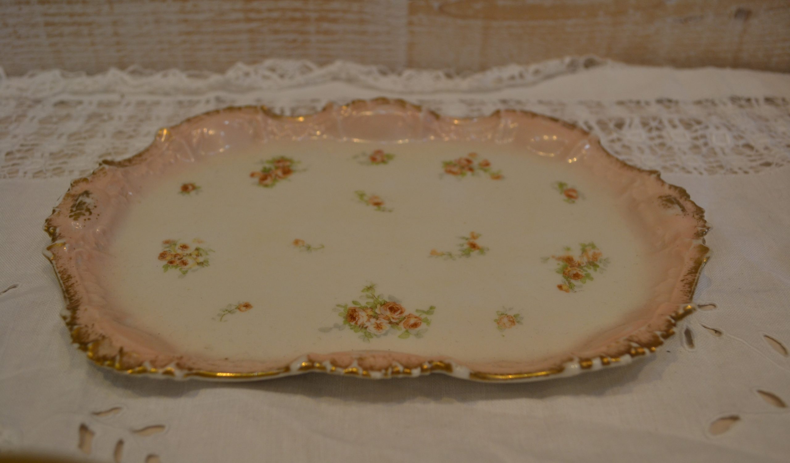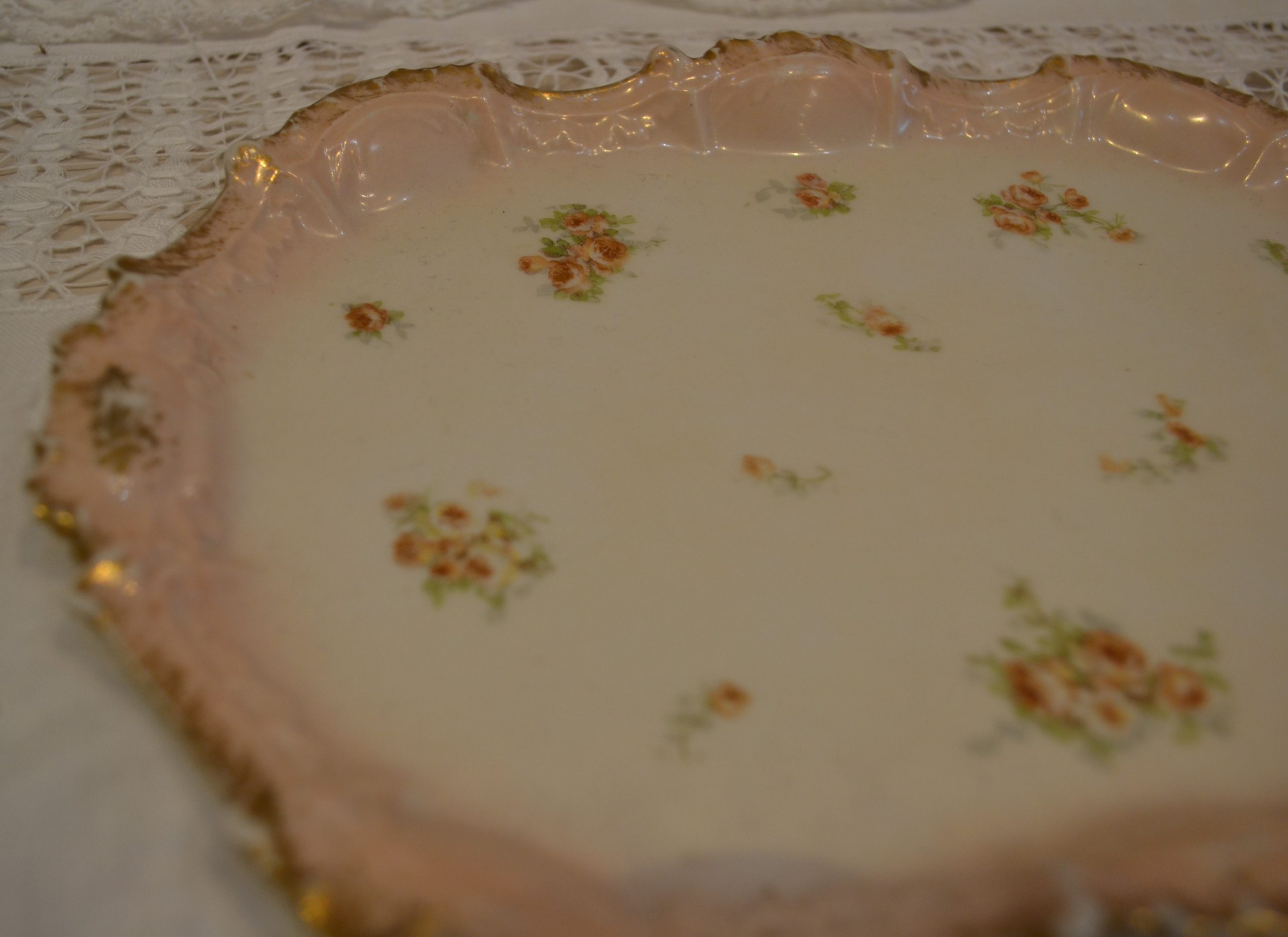 Décoré de délicates roses, contours irréguliers dorés,