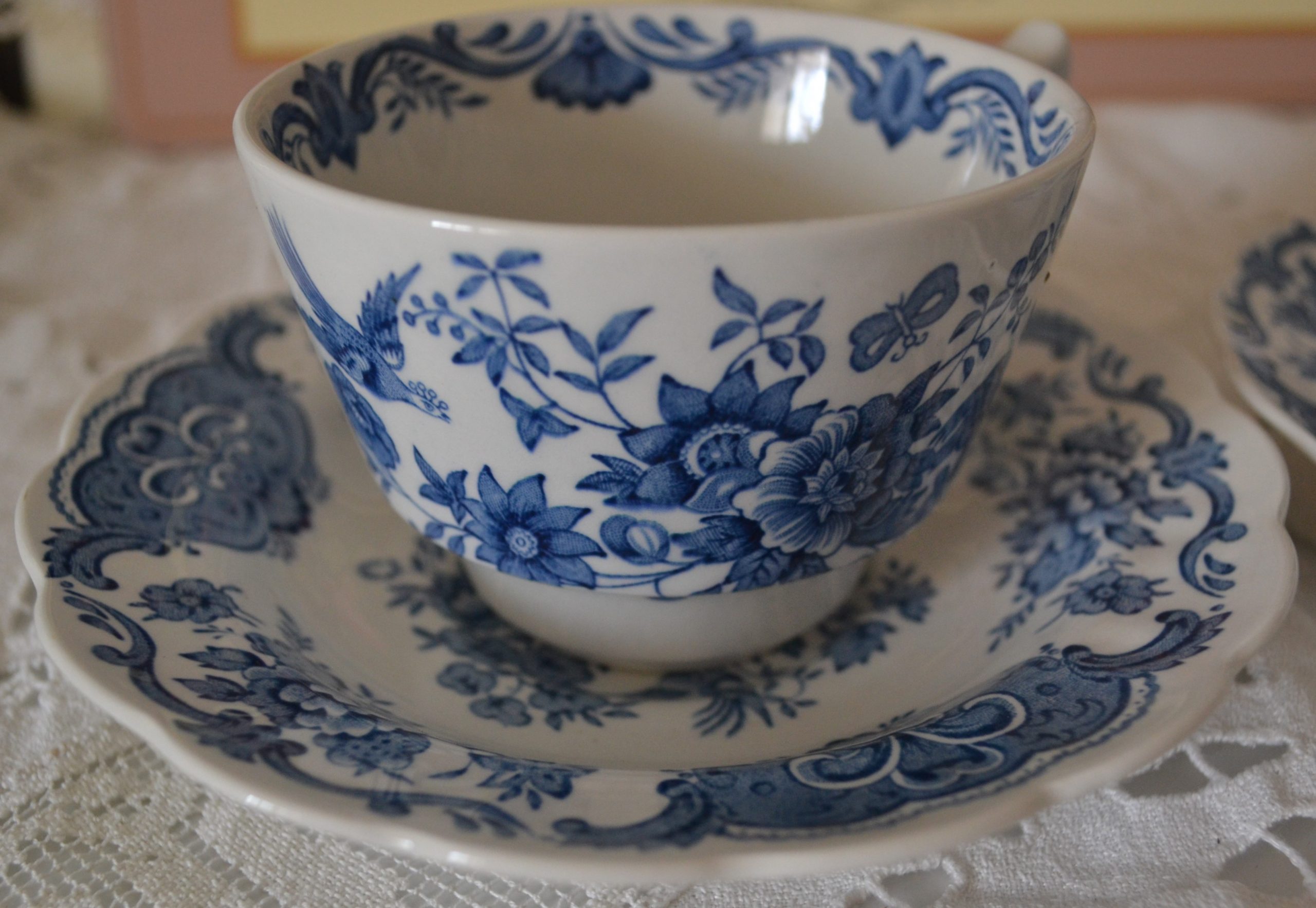 Fond blanc, décors végétal, floral et oiseau bleus. une couronne végétale bleue à l’intérieur également.